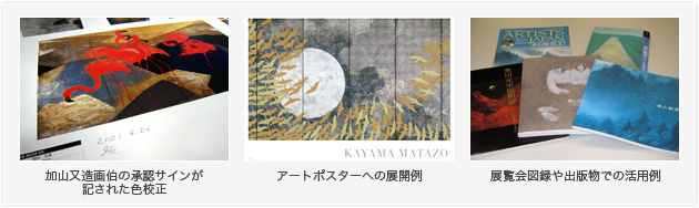 印刷や映像など多彩な用途での使用を目的に、東山魁夷画伯、加山又造画伯をはじめ10数名の著名日本画家と連携し、作家本人および著作権管理者の監修のもと、絵画作品を高精細にデジタル化しています。